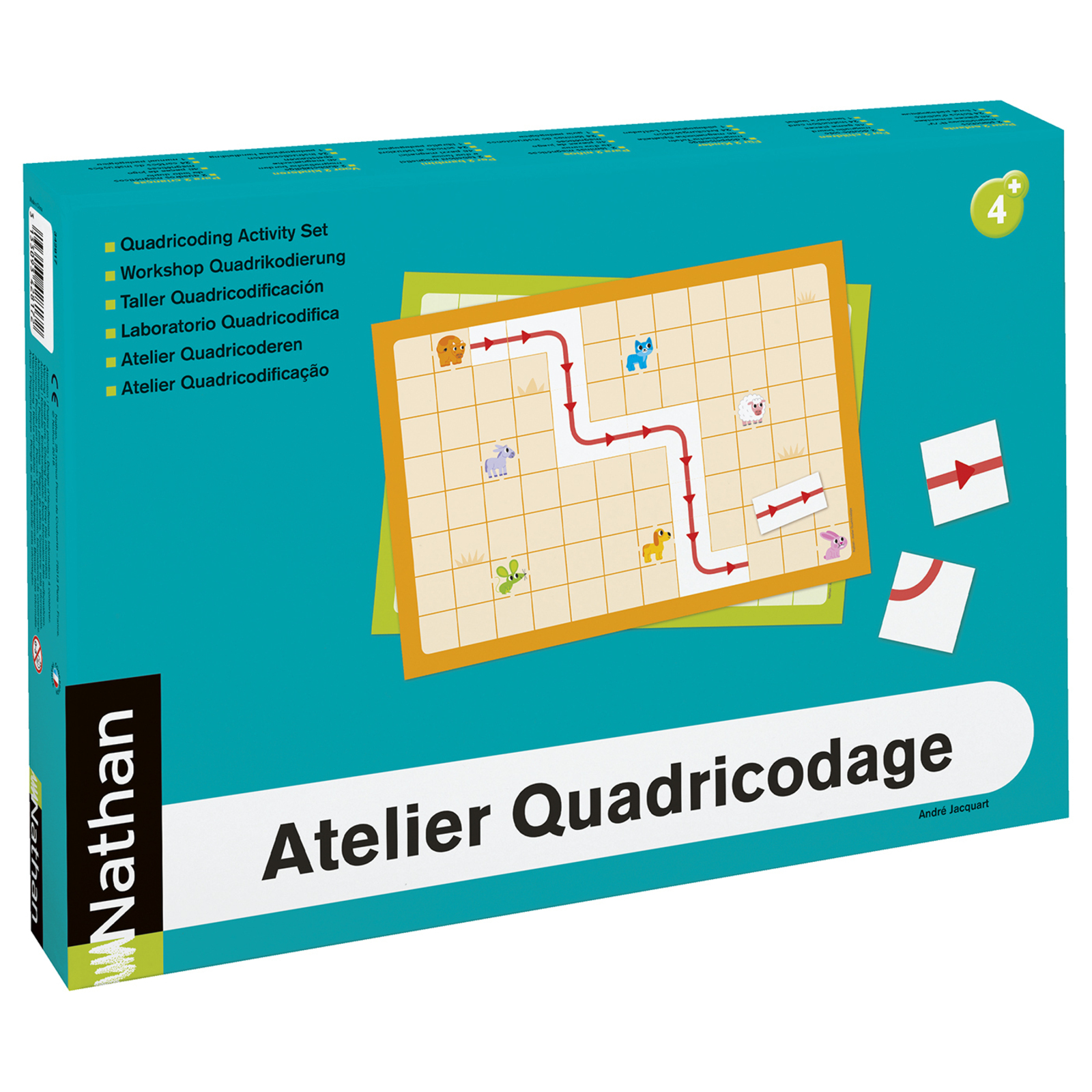 L’organisation de l’atelier est très souple et pratique : les enfants, munis chacun d’une planche et de 23 pièces magnétiques facilement différentiables par leur couleur, peuvent travailler ensemble sur l’une des 24 fiches d’activités. Les parcours à réaliser correspondent à des niveaux de difficulté différents pour favoriser le questionnement et permettre un travail différencié.PROGRESSION DES ACTIVITÉSLes 24 fiches d’activités sont organisées en 4 séries de 6 fiches de difficulté progressive. Dans chaque série, 3 fiches permettent de travailler avec le recto de la planche (les animaux sauvages) et 3 fiches avec le verso (les animaux familiers).Série rond : le parcours est représenté ; le choix des pièces est libre.Série carré : les points de départ, d’arrivée et les types de pièces sont donnés ; aucune quantité n’est imposée.Série triangle : les points de départ, d’arrivée et les types de pièces sont donnés ; certaines quantités sont imposées.Série étoile : les points de départ, d’arrivée et les types de pièces sont donnés ; toutes les quantités sont imposées.COMPÉTENCES DÉVELOPPÉESSe repérer et s’orienter sur un quadrillage.Se déplacer sur un quadrillage, d’un point de départ à un point d’arrivée donnés.Repérer l’orientation d’une pièce.Repérer des longueurs (nombre de cases). La boîte contient :24 fiches d’activités (15 x 10 cm).6 planches magnétiques recto verso (32,5 x 22,5 cm).138 pièces magnétiques (69 pièces flèches rouges et 69 pièces flèches violettes).1 livret pédagogique.