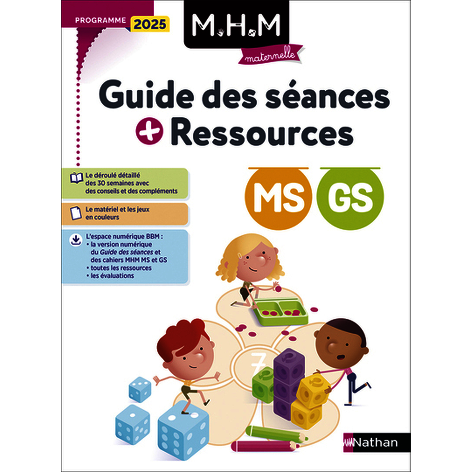 Un outil conforme au nouveau programme pour mettre en œuvre un enseignement structuré autour du jeu, de la manipulation et de la verbalisation, de façon explicite, pragmatique et avec plaisir !Une programmation clés en main sur 30 semaines de 4 jours, laissant de la souplesse pour s’adapter à la vie de la classe. La programmation espacée des apprentissages, propre à MHM, permet d’ancrer l’acquisition des premiers outils mathématiques : les nombres, la résolution de problèmes, les solides et les formes planes, les grandeurs et les motifs organisés.Une organisation adaptée au quotidien de la classe, semaine par semaine, pour que chaque élève fasse au moins 50 minutes de maths chaque jour : deux temps collectifs autour des rituels et de la résolution de problèmes et un temps d’atelier, guidé ou en autonomie. Guide des séances couleurs (384 pages détachables) + Bloc ressources couleurs (168 pages) - Format 22 x 29,7 cm.