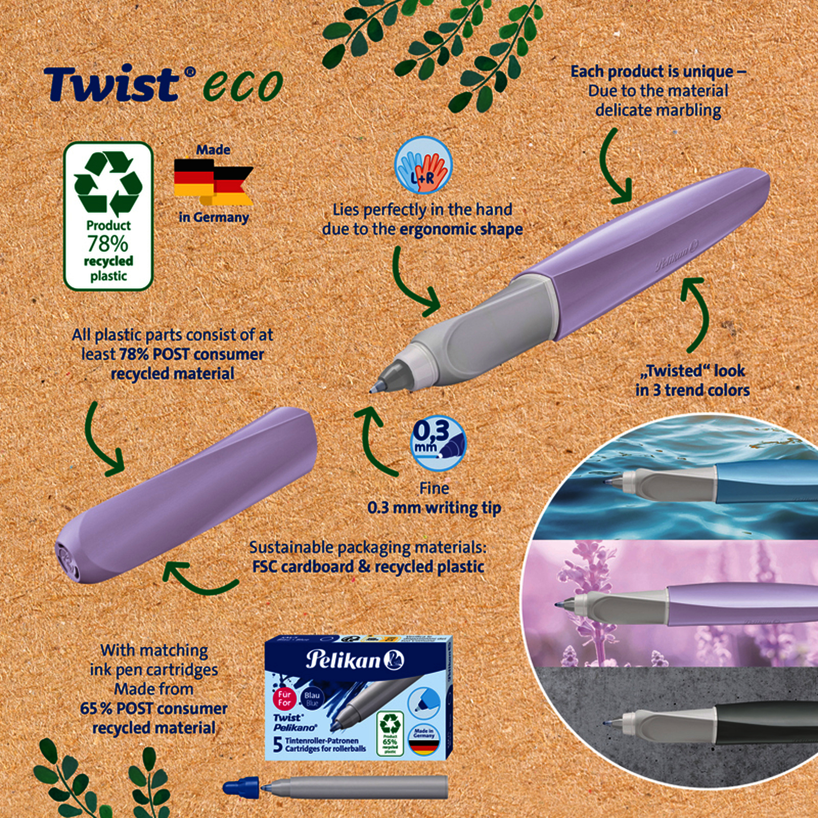 Stylos ergonomiques au design torsadé, zone de préhension douce. Ils assurent une écriture fluide et sans fatigue pour tous les élèves, droitiers ou gauchers. Cartouche roller bleue effaçable incluse.