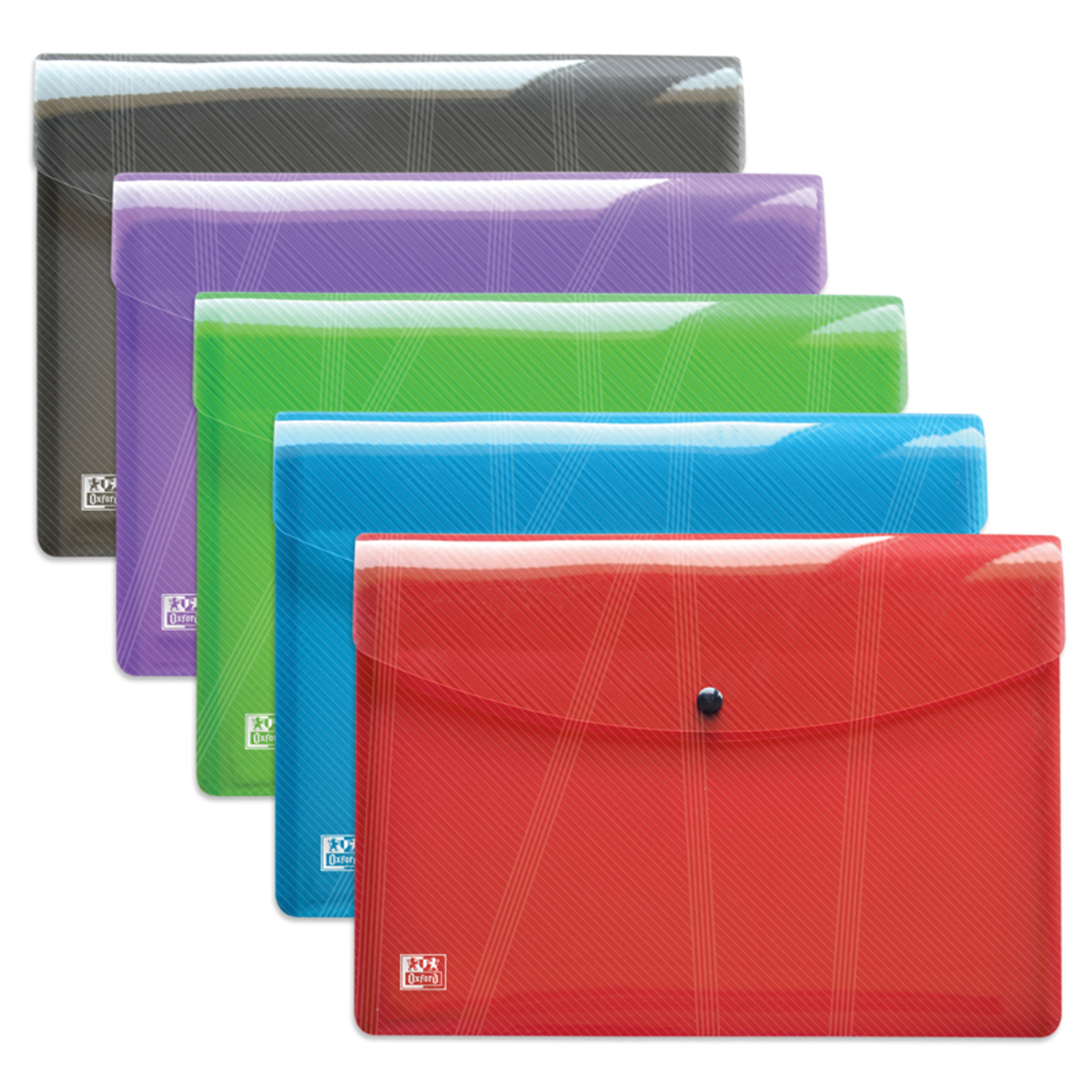 En polypropylène translucide, avec grain ligné. Fermeture par bouton pression, résistance aux taches et à l’eau. Coloris assortis : rouge, gris, bleu, vert et violet.