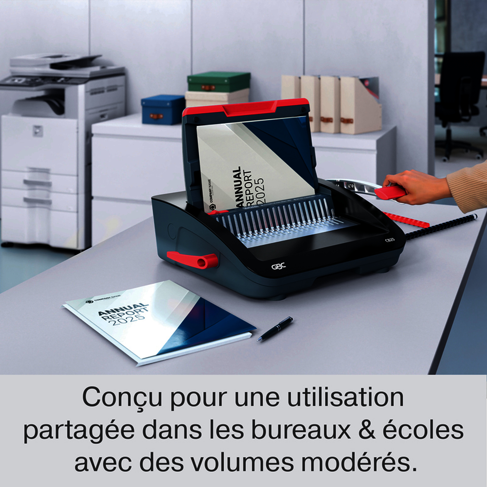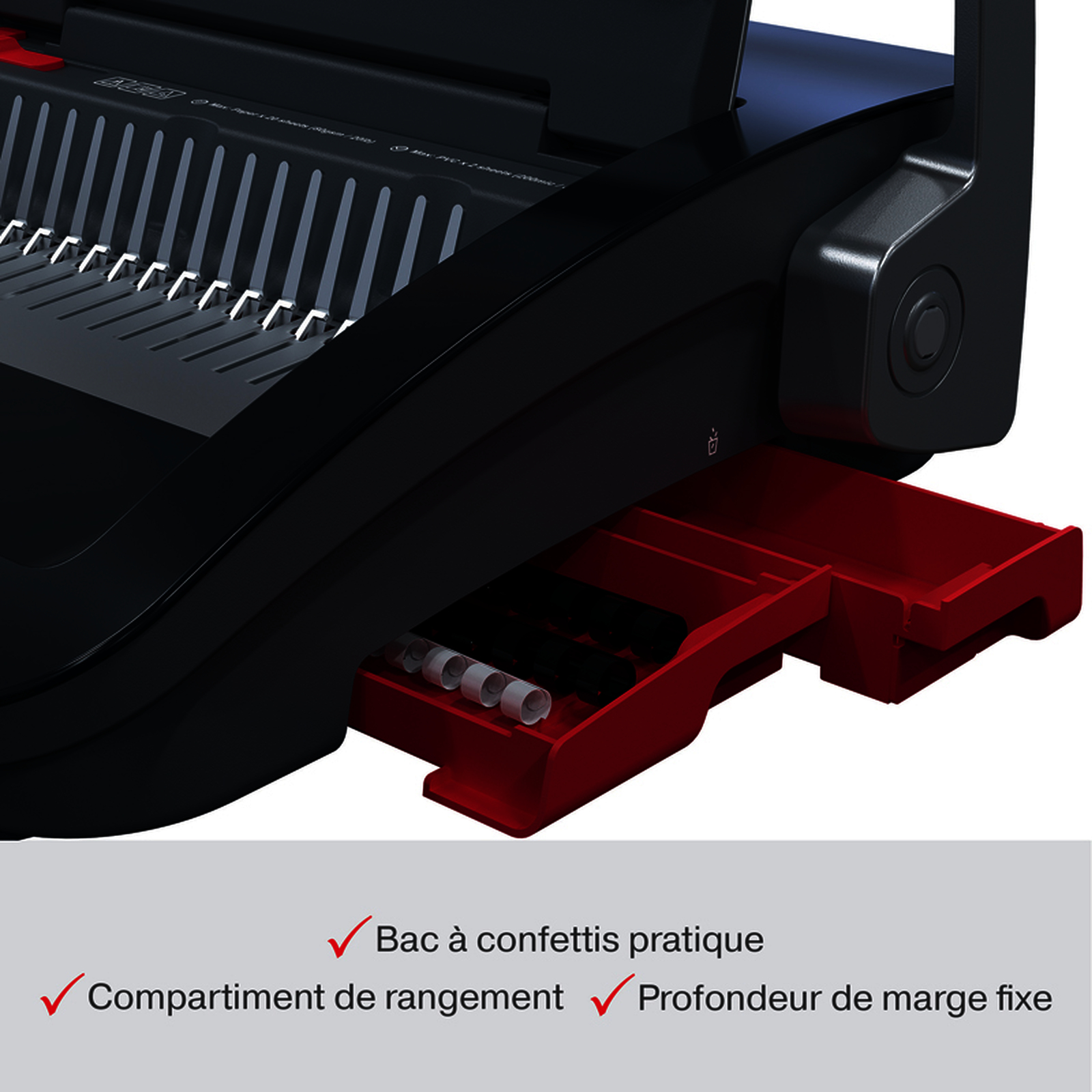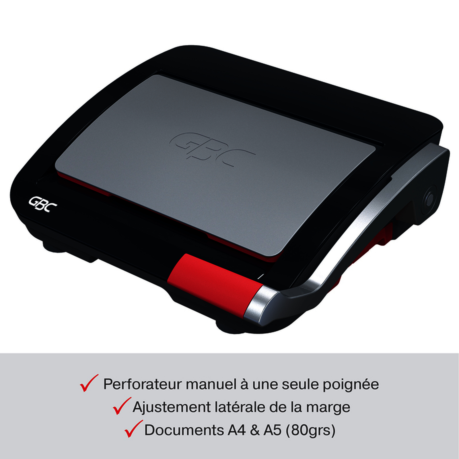 Type de perforation : manuelle - Format : A5, A4 et A3 (petit coté) - Capacité de perforation maximale : 20 feuilles - Capacité de reliure maximale : 330 feuilles (Ø 38 mm) - Butée latérale réglable : pré-réglée - Poids : 6,11 kg - Intensité d'usage : régulier