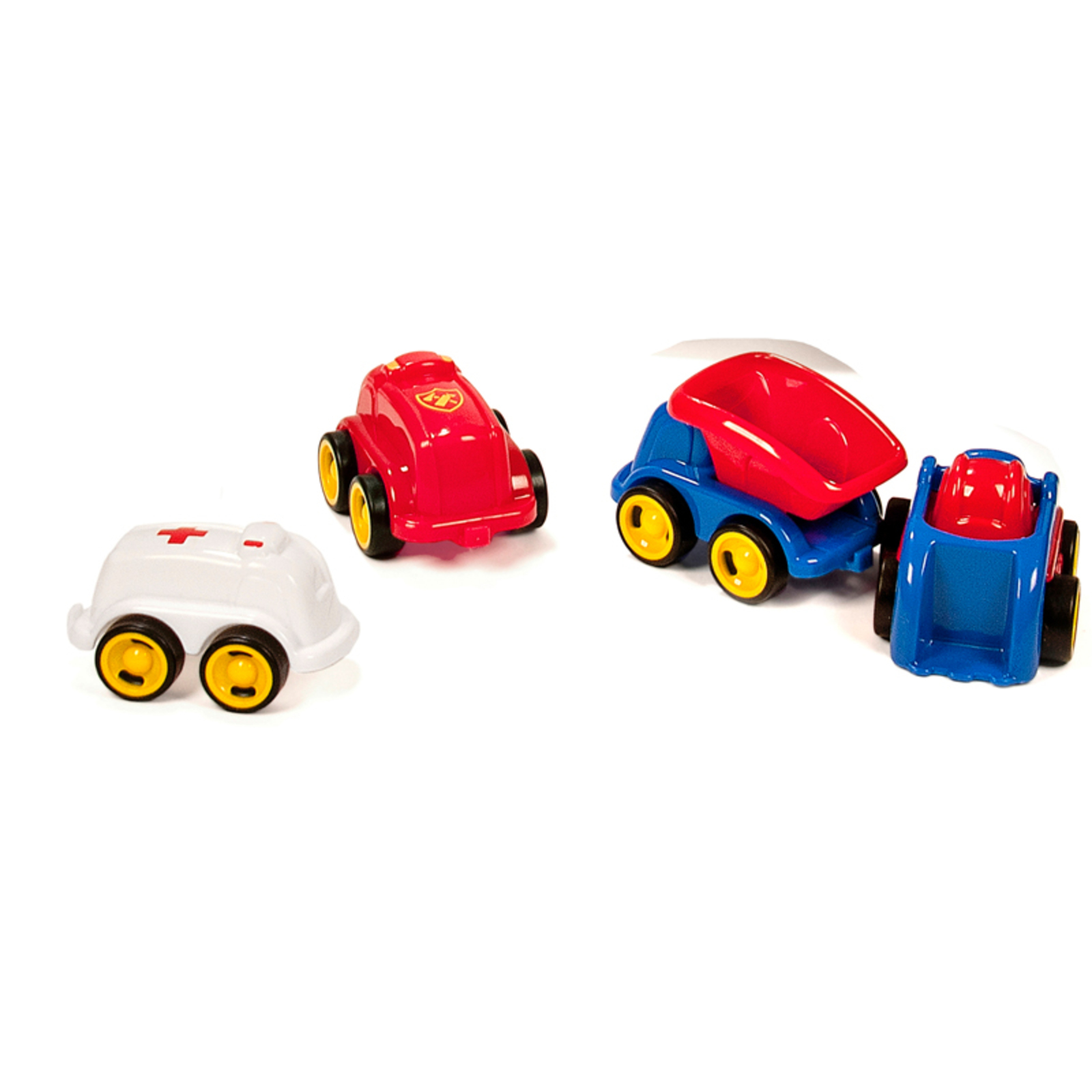 Fait en plastique très résistant. Bords arrondis. Roues caoutchouc silencieuses et non amovibles.Dim. pièce (L) : 12 cm - Le lot de 10 véhicules assortis