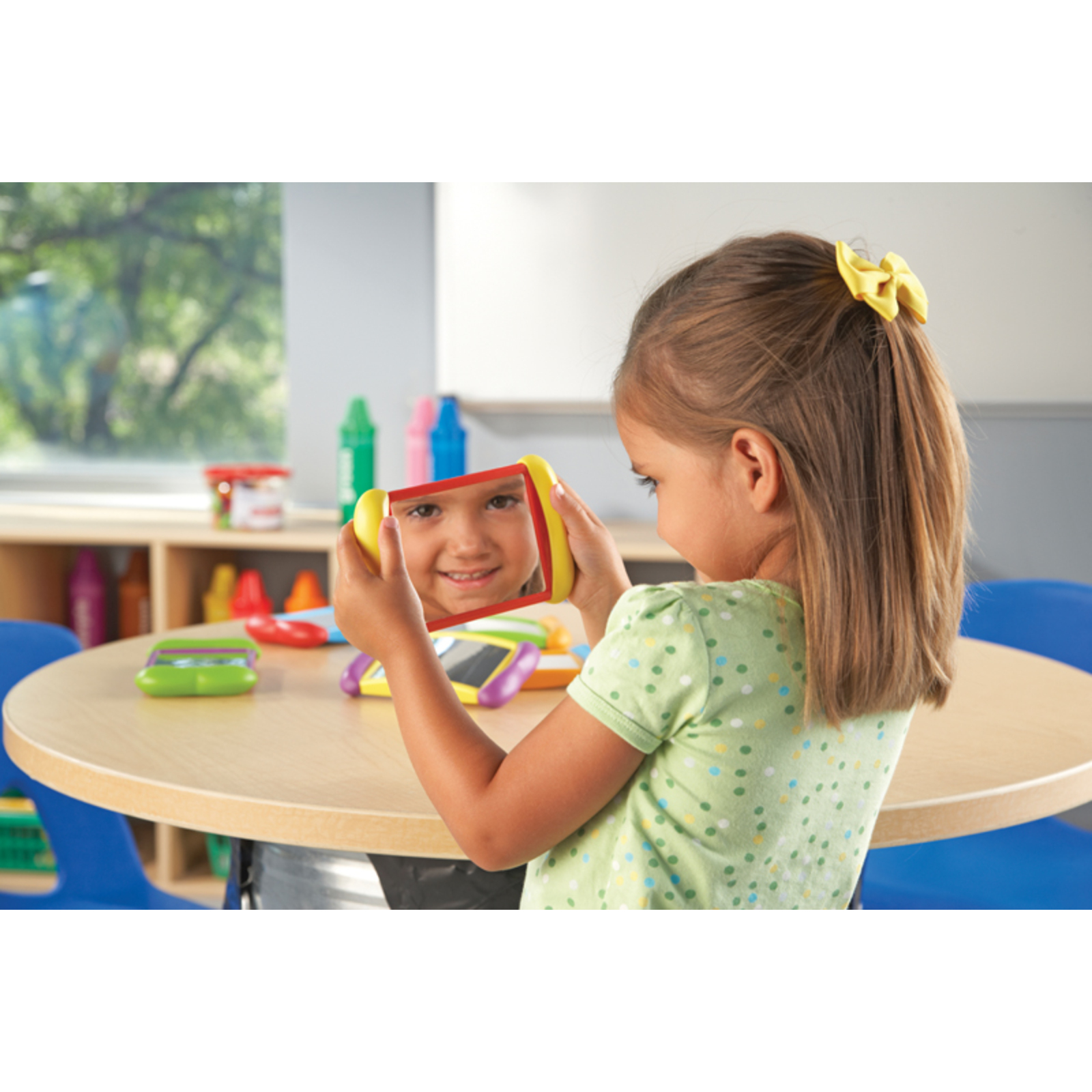 6 miroirs avec poignée en caoutchouc pour une bonne prise en main. Un côté du miroir montre le reflet du visage et l’autre son image déformée. Développe le langage et savoir exprimer ce que l’on voit dans le reflet.Dim. (L x l) : 10 x 7,5 cm - Le lot de 6