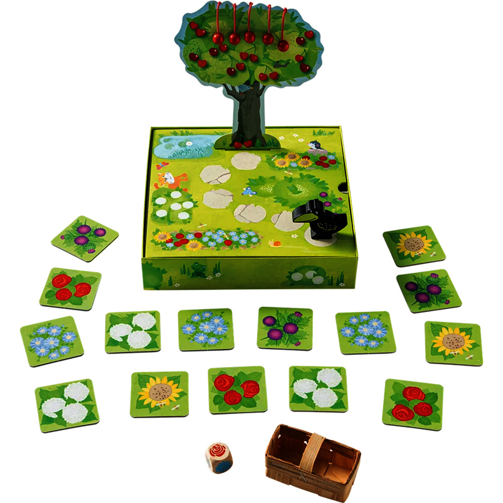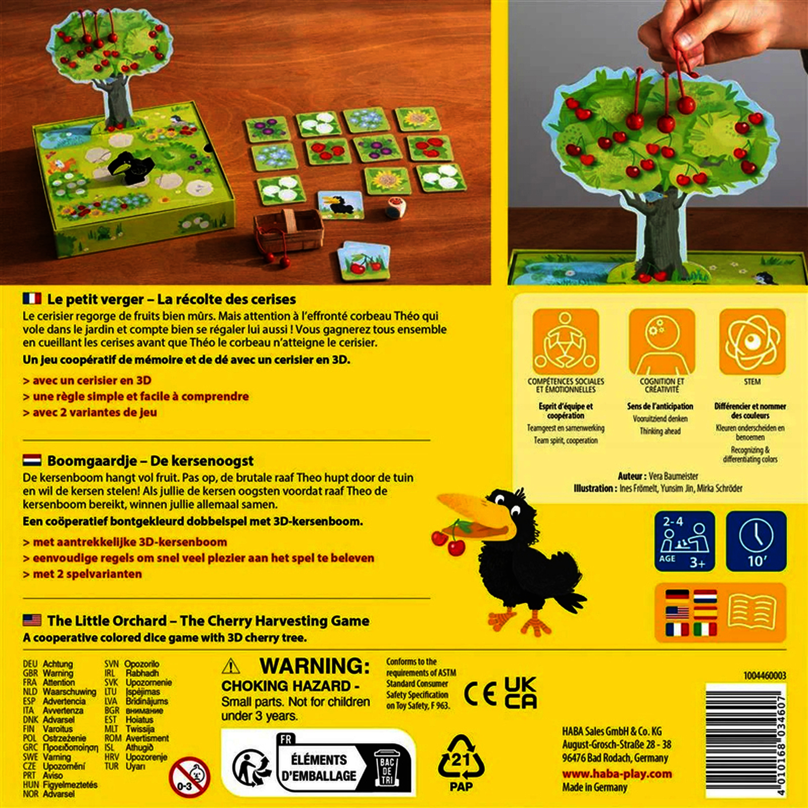 But de jeu : qui du corbeau ou des joueurs récoltera en premier tous les fruits ? Avec des règles adaptées à partir de 2 ans et des accessoires spécialement conçus pour les petites mains, les enfants vont jouer tout en apprenant les couleurs et s'initier aux premières règles du jeu. Contenu : 1 corbeau, 16 fruits et 1 dé en bois issu de forêts gérées, 1 panier pour les fruits et la règle de jeu 1 à 4 joueurs - Durée : 10 min