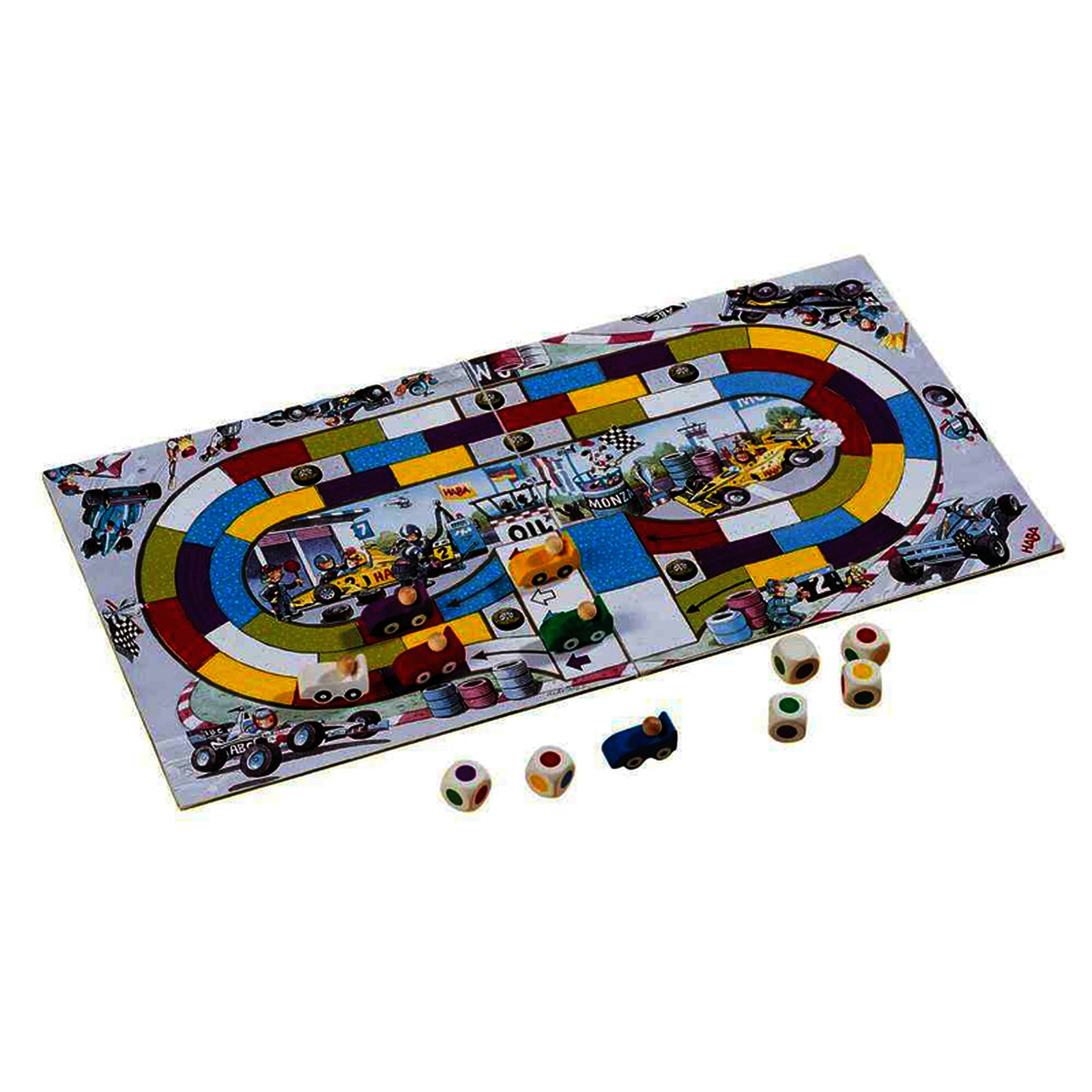 But du jeu : jeu de couses de voitures turbulente où il faut user de tactique et avoir un peu de chance. Les voitures de courses filent comme des flèches. Pour avancer, le jouer doit bien sélectionner ses dés en fonctions des couleurs des cases du plateau. Contenu : 6 voitures de course en bois, 6 dés multicolores en bois, 1 plateau de jeu et la règle du jeu 2 à 6 joueurs - Durée : 10 à 15 min