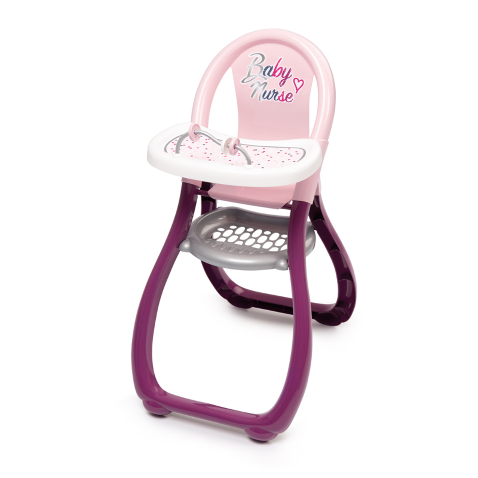 Chaise haute pour poupon jusqu’à 42 cm. 2 accessoires inclus : 1 assiette et 1 cuillère.Dim. (L x l x H) : 36,1 x 10,2 x 51,7 cm - Le lot