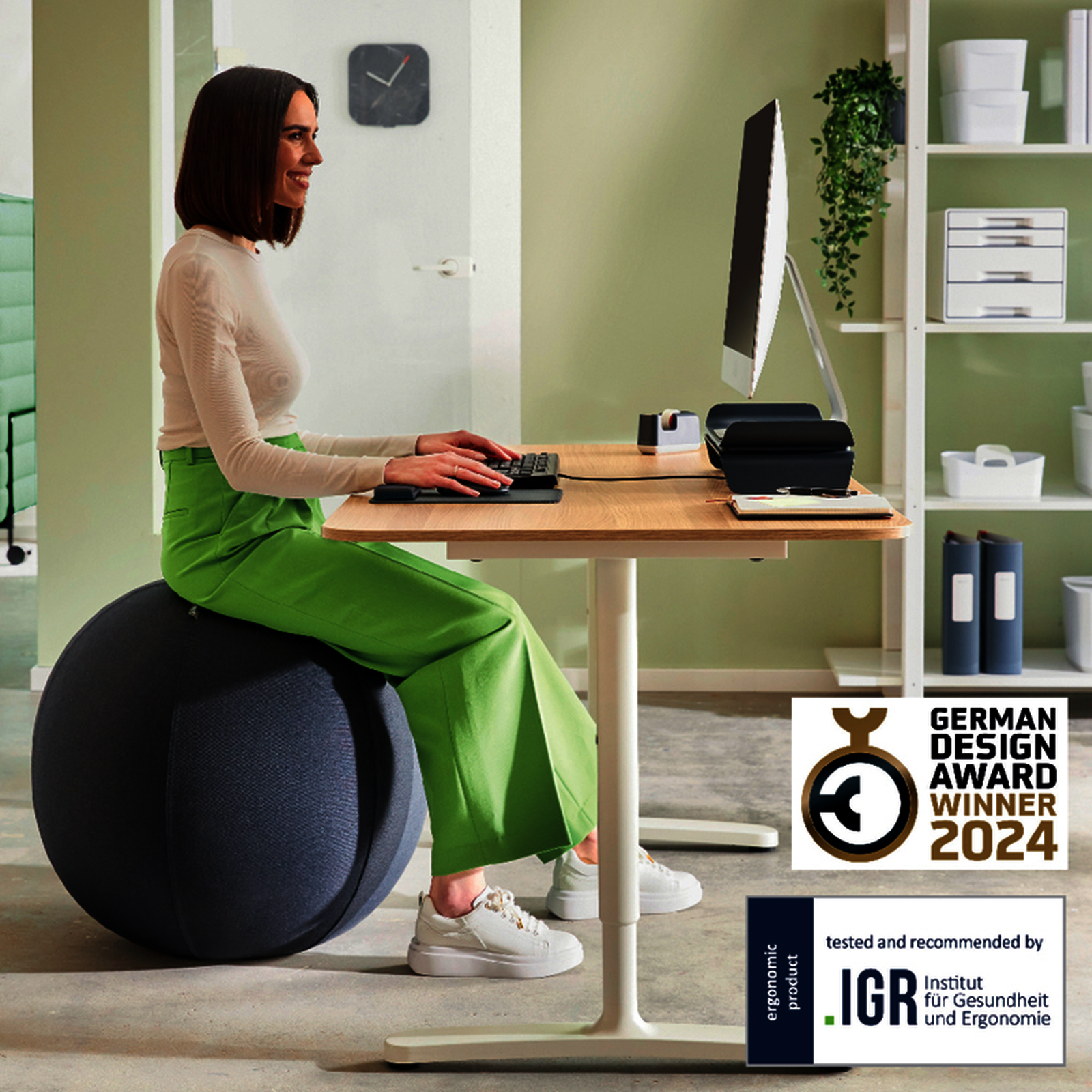 Ballon d?assise anti-basculement Leitz 55?cm pour posture et renforcement du dos et des muscles centraux. S?curis?, ?l?gant et certifi?, il favorise un environnement de travail actif.
